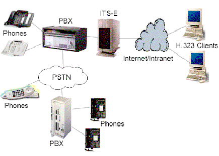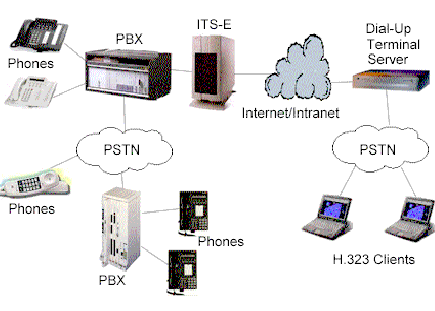 計算機IP電話產(chǎn)品,類似網(wǎng)絡(luò)會議系統(tǒng),允許用戶使用他們當(dāng)前的IP聯(lián)接把通話接到電腦上去(如通過以太網(wǎng)聯(lián)接到他們的局域網(wǎng)中)。這種作法的局限是PC用戶只可以與另一PC用戶通話。然而,使用ITS-E,這種局限將不存在。任何在網(wǎng)絡(luò)上的PC可使用H.323(用于IP電話上的ITU-T標(biāo)準(zhǔn))軟件包來實現(xiàn)通話,如微軟的網(wǎng)絡(luò)會議系統(tǒng),通過ITS-E服務(wù)器通至一個常規(guī)的電話使用者。電話用戶不需要任何新的裝備,甚至不會意識到聲音是從PC機中傳出及在IP網(wǎng)絡(luò)中傳輸。示意圖如下: