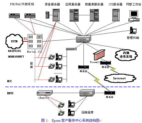 愛普生(中國)的客服系統(tǒng)采用數(shù)據(jù)集中與分散相結(jié)合、座席集中受理的方式進(jìn)行建設(shè)。其中,所有設(shè)備均配置在北京,所有座席均在北京受理客戶服務(wù)請求, 北京將存儲所有的用戶數(shù)據(jù)和業(yè)務(wù)數(shù)據(jù),上海和廣州將按照北京的數(shù)據(jù)庫,每天進(jìn)行同步和備份。客服中心配置了前端接入平臺、CTI服務(wù)器、數(shù)據(jù)庫服務(wù)器、應(yīng)用服務(wù)器、IVR/FAX、外撥服務(wù)器等設(shè)備。