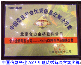 2006年1月10日,北京。中國計算機用戶協(xié)會"2005年度企業(yè)及產(chǎn)品頒獎典禮"在世紀金源大飯店隆重召開。在Call Center(呼叫中心)及CRM(客戶關(guān)系管理)領(lǐng)域位居業(yè)界領(lǐng)先地位的HOLLYCRM(合力金橋軟件)公司自主知識產(chǎn)權(quán)的HollyC6呼叫中心解決方案再度成為業(yè)界關(guān)注焦點,榮獲"中國信息產(chǎn)業(yè)2005年度優(yōu)秀解決方案"大獎。