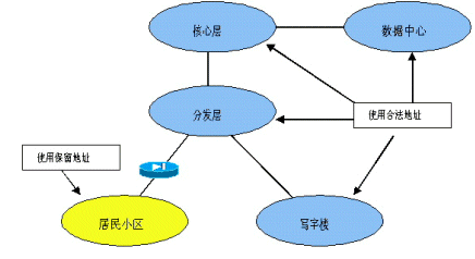 考慮IP地址資源有限,因此,居民小區(qū)接入用戶量大,地址使用效率低,因此在居民小區(qū)部分采用RFC 1519規(guī)定的保留地址,建議采用10.0.0.0。在每個(gè)小區(qū)的出口處配備地址轉(zhuǎn)換設(shè)備,實(shí)現(xiàn)保留地址和合法地址之間的轉(zhuǎn)換。