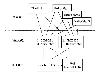 硬件平臺(tái)呈3層結(jié)構(gòu),分別為應(yīng)用層、Infranet計(jì)費(fèi)和用戶管理層以及數(shù)據(jù)庫層。