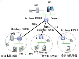 對于視頻的互通,則采用專用的視頻網(wǎng)關(guān),在中心處配置一臺(tái)MCU作為整個(gè)網(wǎng)絡(luò)視頻系統(tǒng)的管理者,1、2、3節(jié)點(diǎn)則配置具有視頻網(wǎng)關(guān)功能的視頻終端。在網(wǎng)上召開視頻會(huì)議時(shí),各會(huì)場的加入和畫面的調(diào)度都由位于中心的MCU進(jìn)行控制。通過視頻網(wǎng)關(guān)壓縮的圖像的帶寬為512kbps。
