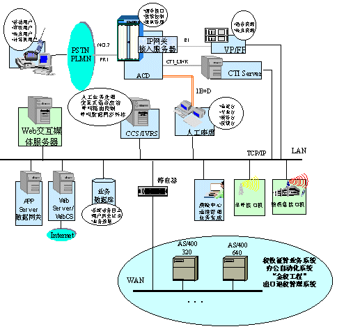 在深圳國稅局方案中,整個系統(tǒng)的建設按三期規(guī)劃進行。第一期的目標主要是搭建呼叫中心平臺,包括ACD(排隊機)、IVR(交互式語音應答系統(tǒng))、CCS(華為呼叫中心中間件)等軟硬件設備。ACD作為整個系統(tǒng)的核心接入設備,采用了華為公司的C&C08-Q排隊機。C&C08-Q是大容量高可靠性的數(shù)字排隊機,通過中國七號信令或ISDN PRI接入PSTN,排隊機提供CTI接口,可支持兩個10M通訊速率,為計算機業(yè)務系統(tǒng)和交換系統(tǒng)提供足夠帶寬的數(shù)據(jù)交換通道,可內(nèi)置計算機撥號接入框和IP網(wǎng)關(guān),提供包括數(shù)據(jù)、語音、視頻在內(nèi)的多媒體接入功能,電話接入和計算機接入可實現(xiàn)同號接入。IVR、CCS與ACD采用一體話平臺設計方式,使整個呼叫中心系統(tǒng)結(jié)構(gòu)更緊湊,運行效率更高。Intess平臺還提供了用于自動業(yè)務的全中文化的開發(fā)工具SCE,用于開發(fā)人工座席軟件的API函數(shù)和ActiveX件,以及模擬開發(fā)測試環(huán)境,使業(yè)務系統(tǒng)的開發(fā)更方便快捷。
