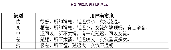 MOS(MeanOpinionScore)是一種常用的主觀評(píng)價(jià)標(biāo)準(zhǔn)。IP電話業(yè)務(wù)的MOS定義為四級(jí):4.0-5.0(優(yōu))、3.5-4.0(良)、3.0-3.5(中)、1.5-3.0(差)、0-1.5(劣)。用戶滿意度和MOS等級(jí)的對(duì)應(yīng)關(guān)系見表2。