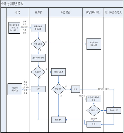 后臺(tái)處理座席員根據(jù)業(yè)務(wù)知識(shí)、資料庫和管理職責(zé)為市民服務(wù),如果不能處理,將請求提交相關(guān)政府部門并限時(shí)處理;