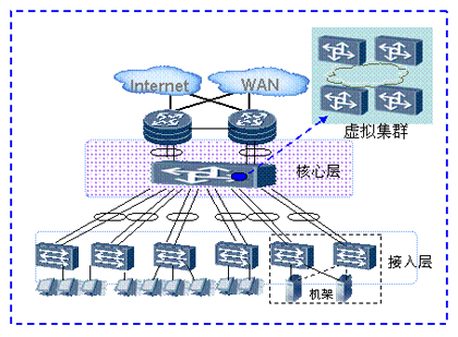 如上圖所示,整個(gè)數(shù)據(jù)中心網(wǎng)絡(luò)通過虛擬集群技術(shù),多個(gè)核心層設(shè)備虛擬為一臺(tái)設(shè)備。通過增加核心節(jié)點(diǎn),提供無阻塞的網(wǎng)絡(luò)能力,接入更多服務(wù)器。服務(wù)器的規(guī)?梢詮3000臺(tái)“無級(jí)擴(kuò)展”到數(shù)萬臺(tái)。在滿足企業(yè)日益增長(zhǎng)的業(yè)務(wù)需求的同時(shí),并不增加網(wǎng)絡(luò)的復(fù)雜度,減少管理和維護(hù)的成本。