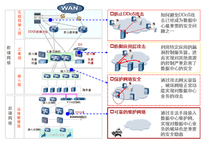 隨著各種黑客工具的推陳出新,數(shù)據(jù)中心面臨的安全威脅越來越大。數(shù)據(jù)中心網(wǎng)絡(luò)的安全必須從多個(gè)維度進(jìn)行設(shè)計(jì)。