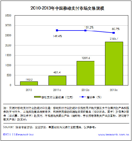 艾瑞咨詢數(shù)據(jù)顯示,截至2011年底,中國移動支付交易規(guī)?傤~將達(dá)到481.4億元,同比增長149.4%,整體呈現(xiàn)爆發(fā)式的增長態(tài)勢。艾瑞預(yù)計,中國移動支付交易規(guī)模將在2013年底超過2000億元。