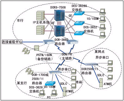 對于業(yè)務比較少的網(wǎng)點,使用DCR-2501或DCR-2509路由器;對于業(yè)務比較多的網(wǎng)點,使用DCR-2511或DCR-1720或DCR-1750路由器。營業(yè)網(wǎng)點使用DCR-2500或1700系列路由器,既實現(xiàn)柜員終端、IP業(yè)務等綜合業(yè)務接入,又能用以太口將辦公網(wǎng)絡(luò)連接起來,實現(xiàn)真正的綜合業(yè)務接入。原有遠程終端可以直接連在DCR-2500或1700系列路由器上,通過IP網(wǎng)絡(luò)訪問網(wǎng)絡(luò)內(nèi)任意位置的業(yè)務前置機,無須改動原有業(yè)務軟件,輕松實現(xiàn)銀行綜合業(yè)務。終端通過上述路由器可訪問支行和分行不同局域網(wǎng)上的多臺前置機,訪問時,不需要調(diào)用前置機的TELNET服務,且終端號固定。
