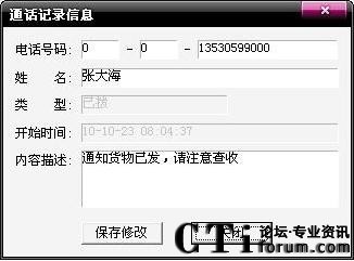 在A8電腦傳真機(jī)的電話商務(wù)通軟件主界面,雙擊通話記錄中的某個客戶號碼,或選中該號碼點擊下面的通話歷史按鈕,您與該客戶的通話歷史便一覽無余。選中某個記錄,您可以對其進(jìn)行編輯(添加姓名、備注該次通話的內(nèi)容),刪除,軟件撥出,加入電話簿等操作。
