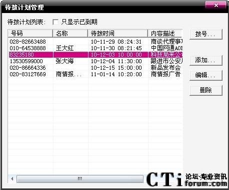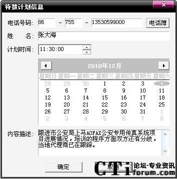 A8電腦傳真機(jī)的通話記錄和通話歷史讓您記住過去,來電彈屏和自動答錄助您處理現(xiàn)在,待撥計劃和到時提醒則幫您安排未來。點擊電話商務(wù)通主界面中的待撥計劃按鈕,出現(xiàn)您未來將要撥出電話的日程安排,您可以對其進(jìn)行添加、編輯和刪除等操作。時間一到A8電腦傳真機(jī)會自動彈屏提醒,待撥計劃中的電話一經(jīng)撥出,A8會自動刪除該電話號碼。