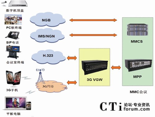 艾諾通信3G視頻會(huì)議解決方案由MMC(Multi-Media Conference)多媒體會(huì)議系統(tǒng)和VGW(Video Gateway)視頻網(wǎng)關(guān)兩部分組成。MMC多媒體會(huì)議系統(tǒng)是基于SIP/H.323雙協(xié)議設(shè)計(jì)、大容量全開(kāi)放式的多媒體系統(tǒng)。該系統(tǒng)可以與IMS/NGN/NGB無(wú)縫對(duì)接,系統(tǒng)擴(kuò)展性好,兼容各種終端;可以和現(xiàn)有H.323視頻會(huì)議系統(tǒng)對(duì)接,實(shí)現(xiàn)3G移動(dòng)視頻會(huì)議。VGW視頻網(wǎng)關(guān)同時(shí)具備H.323信令和媒體轉(zhuǎn)換的功能。