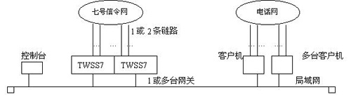 操作系統(tǒng)可以是SCOUNIX ,Windows95/NT。網(wǎng)傳通訊協(xié)議TCP/IP。不同的客戶機(jī)可以運(yùn)行不同的應(yīng)用軟件。七號(hào)控制臺(tái)用于網(wǎng)關(guān)維護(hù)和鏈路管理、參數(shù)設(shè)置等,運(yùn)行于單獨(dú)機(jī)器或某臺(tái)客戶機(jī)上。在簡單的應(yīng)用中,控制臺(tái)也可以省略。