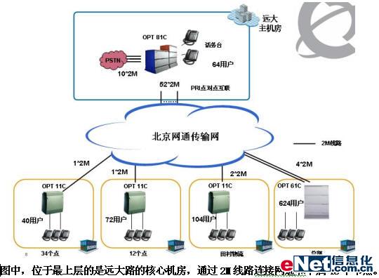 新的網(wǎng)絡(luò)建成以遠(yuǎn)大路中心機(jī)房為核心的星形網(wǎng)絡(luò),租用北京網(wǎng)通2M專線的方式同各個(gè)門市店連接。各個(gè)門市店設(shè)立了自己的程控交換機(jī),并通過E1中繼方式和核心機(jī)房實(shí)現(xiàn)全網(wǎng)互聯(lián)。在此方案中,所有的市話呼入和呼出都通過核心節(jié)點(diǎn)同網(wǎng)通之間的中繼通道,從而實(shí)現(xiàn)大中電器內(nèi)部話音通訊的統(tǒng)一編號(hào)方案、統(tǒng)一撥號(hào)規(guī)則、統(tǒng)一維護(hù)和管理;并對(duì)外公布公開和便于記憶的號(hào)碼,以配合網(wǎng)點(diǎn)的促銷活動(dòng),以及未來客戶服務(wù)等應(yīng)用的擴(kuò)展。