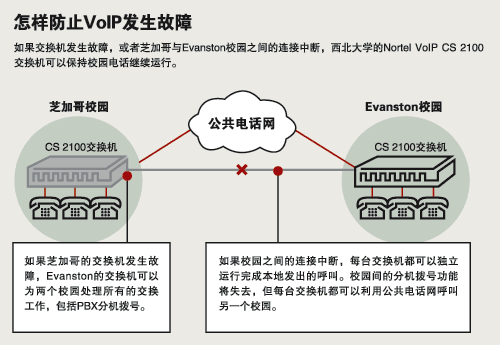 美國西北大學(xué)原來的兩臺運(yùn)營商級SL-100電話交換機(jī)(一臺安裝在芝加哥校園,一臺安裝在Evanston校園)已經(jīng)用了差不多20年。升級的目標(biāo)是將兩臺獨(dú)立的交換機(jī)合并為一臺邏輯交換機(jī)來減少管理復(fù)雜性。同時(shí),不必更換全部數(shù)字電話。最終他們決定升級到同時(shí)支持VoIP和TDM的Nortel CS 2100 VoIP,這樣用戶不用被迫把他們的電話換為VoIP電話。Carr說:“不管是那些希望利用VoIP性能的用戶,還是想繼續(xù)使用當(dāng)前電話特性和服務(wù)的用戶,可以各取所需。”
