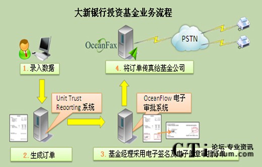 大新銀行采用OceanFax傳真服務(wù)器收發(fā)電子傳真,并將OceanFax與Unit Trust Reporting 系統(tǒng)及OceanFlow電子審批系統(tǒng)整合,理順投資基金流程,包括訂單生成、審批及傳真發(fā)送,實(shí)現(xiàn)完美自動(dòng)流程,提高效率、降低成本及保證信息安全。
