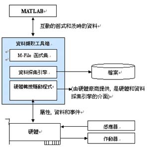 數(shù)據(jù)采集工具箱是一組M-File 函式集和MEX-File 等動(dòng)態(tài)鏈接鏈接庫(kù)所組成的, 專門(mén)使用在數(shù)據(jù)采集方面的一組函式庫(kù). 它提供了以下主要的功能