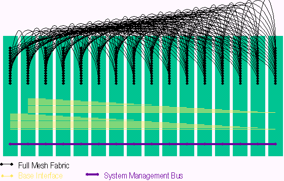 PICMG 3.0包含多種傳輸,這些傳輸模式如圖由下而上依序提供系統(tǒng)管理層、控制層、資料層等的聯(lián)接。系統(tǒng)管理是基于一條與各槽位都相連的I2C 雙串行信號(hào)線, 系統(tǒng)管理信息則是基于IPMI規(guī)范被擴(kuò)展到在PICMG3.0規(guī)范中使用。系統(tǒng)管理總線也是冗余方式確保在一條總線故障情況下,管理信息仍正常傳遞。在資料層旁邊的控制層稱作Base 接口 (Base Interface),Base接口是一個(gè)雙星型的拓?fù)浣Y(jié)構(gòu)具有冗余的交換刀片和以太網(wǎng)BAST-T信號(hào),在PICMG 3.0中提供IP傳輸,這點(diǎn)在架構(gòu)定義上非常像PICMG 2.16。PICMG 3.0單板的高速數(shù)據(jù)傳輸是通過(guò)Fabric接口 (Fabric Interface),F(xiàn)abric接口是基于3.125Gbps SERDES信號(hào),可以在星型和全網(wǎng)狀結(jié)構(gòu)中支持10Gb的傳輸速率。正如上面提到的,PICMG 3.0核心規(guī)范定義了Fabric接口的信號(hào)和互聯(lián),而輔助規(guī)范定義了用于傳輸?shù)膮f(xié)議。PICMG 3.0 背板的互聯(lián)支持全網(wǎng)狀Fabric接口,雙星型Base接口和冗余的系統(tǒng)管理,如下圖所示: