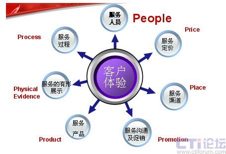 下面這張圖是服務(wù)營銷的7P模型,在這里我認(rèn)為最應(yīng)該關(guān)注的是People——人。這里,我想引用世界經(jīng)理人刊登的一篇文章“影響中國的十大管理理念”上的一段文字:“邁向服務(wù)型經(jīng)濟實際上就是邁向人才經(jīng)濟。在制造業(yè)中,價值是由機器創(chuàng)造的。在服務(wù)業(yè)中,價值則是人創(chuàng)造的!边@也是在服務(wù)業(yè)中,要將“人”進行體現(xiàn)。也許你不在乎為你制造產(chǎn)品的工人長的美或丑,但為客戶服務(wù)的人員如果長的很丑,對服務(wù)就會有一定的影響。大家只看產(chǎn)品結(jié)果,不關(guān)注過程,但是服務(wù)卻是與過程緊密的結(jié)合。