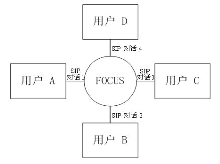 緊耦合會(huì)議的邏輯架構(gòu)圖如圖三所示。會(huì)議中的核心是“會(huì)議中心(conference focus)”,每一個(gè)會(huì)議都有一個(gè)會(huì)議中心,由一個(gè)URI標(biāo)識(shí),用戶通過聯(lián)系這個(gè)URI參加到一個(gè)會(huì)議中去。會(huì)議中心和用戶之間的拓?fù)浣Y(jié)構(gòu)為星性結(jié)構(gòu)。會(huì)議中心為用戶提供并維持一個(gè)信令連接,并且可以執(zhí)行會(huì)議策略,實(shí)現(xiàn)對(duì)會(huì)議的控制和管理。