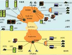 杭州秋濤局配置的是A7505中繼網(wǎng)關(guān)、A1540接入網(wǎng)關(guān)以及其他的綜合接入設(shè)備、SIP終端、H.323終端等。A7505同當?shù)亟粨Q機配合可以經(jīng)由IP骨干網(wǎng)實現(xiàn)上海到杭州的長途語音業(yè)務(wù)。A1540及經(jīng)由它的ST700可以實現(xiàn)NGN的語音數(shù)據(jù)業(yè)務(wù)。杭州到上海的連接是通過中國電信的IP骨干網(wǎng)實現(xiàn)的。
