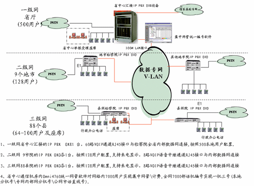 根據(jù)合同,阿爾卡特將提供1套Omni PCX Enterprise(面向大中型企業(yè)的通信平臺)500用戶作為核心交換節(jié)點(diǎn),97套Omni PCX Office(面向中小型企業(yè)的通信平臺)系統(tǒng)分別為60-160用戶作為分支交互節(jié)點(diǎn)。全網(wǎng)支持多達(dá)7000多個用戶,覆蓋貴州省檢察院、9個地市檢察院和88個區(qū)縣檢察院。在設(shè)計組網(wǎng)方案時,阿爾卡特根據(jù)用戶的需求和實(shí)際情況,并充分考慮現(xiàn)有的數(shù)據(jù)網(wǎng)絡(luò)資源,提出采用點(diǎn)對多點(diǎn)的網(wǎng)絡(luò)結(jié)構(gòu)建設(shè)VOIP語音網(wǎng)絡(luò),不僅可以充分保障通信的安全性和可靠性,同時還可最大限度保護(hù)現(xiàn)有投資,節(jié)省費(fèi)用。