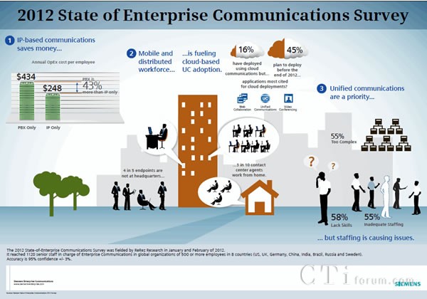 CTI論壇(ctiforum)5月9日消息(記者 歐陽(yáng)): 今日,西門子企業(yè)通信近日公布了其《2012年企業(yè)通信形勢(shì)研究》,結(jié)果顯示純IP構(gòu)架與傳統(tǒng)PBX系統(tǒng)相比為企業(yè)節(jié)約了43%的成本。研究還顯示,隨著企業(yè)員工移動(dòng)性的不斷增加,更多企業(yè)被迫采用云技術(shù),同時(shí)員工培訓(xùn)和人員編制緊張經(jīng)常會(huì)拖延公司向統(tǒng)一通信(UC)平臺(tái)的轉(zhuǎn)移。