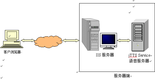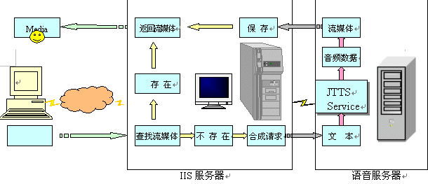 語音服務器方案是指利用捷通華聲在CTI領域成熟應用的jTTS Service語音服務器,增加一臺或多臺語音服務器到現(xiàn)有的IIS服務系統(tǒng)的網絡環(huán)境中;在IIS服務器中,增加訪問語音服務器的功能。當IIS服務器需要流媒體輸出時,向語音服務器發(fā)出請求,語音服務器接受IIS服務器的請求,并對請求的數(shù)據進行合成、格式轉換,得到流媒體后返回給IIS服務器,IIS服務器再將此流媒體傳輸給用戶。