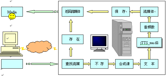 瀏覽器端(Explorer)發(fā)出瀏覽請求時,加在Web頁面的服務器端ASP程序和腳本程序自動響應,根據請求查找流媒體(音頻流)文件,如有,則將流媒體返回客戶端,并啟動客戶端的MS media player播放流媒體。若沒有,則向通過COM控件(TTSPlayer.dll)的傳遞函數(shù)向COM傳遞參數(shù),并發(fā)送合成請求;COM控件根據參數(shù)和請求調用捷通華聲語音合成系統(tǒng)jTTS(jTTS_ma.dll)生成Wave格式的音頻文件,并返回給COM控件;COM控件得到之后再調用WMF SDK將所生成的音頻文件轉換成流媒體格式ASF,在保存到指定目錄后開始將此流媒體返回客戶端,啟動MS media player播放。其流程如下: