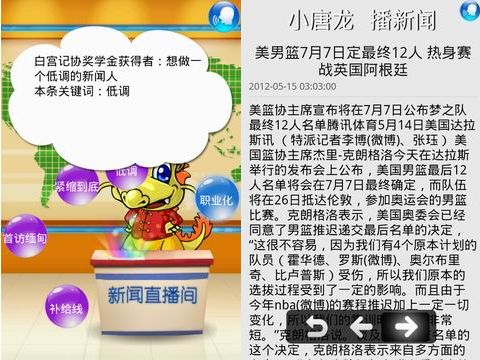 CTI論壇(ctiforum)5月17日消息(記者 歐陽(yáng)): 2012年5月9日,中國(guó)第一個(gè)全方位智能交互手機(jī)助手“小唐龍”正式上線,小唐龍是一個(gè)基于Android系統(tǒng)的智能手機(jī)助手,它可隨時(shí)隨地幫助手機(jī)用戶進(jìn)行聊天、歌曲點(diǎn)播、聽(tīng)新聞、地圖導(dǎo)航、互聯(lián)網(wǎng)信息查詢等多方面服務(wù),其中《唐龍新聞》以新穎獨(dú)特成為小唐龍的閃亮點(diǎn)。當(dāng)拿起手機(jī)對(duì)著“小唐龍”說(shuō),“聽(tīng)新聞”,“小唐龍”的播報(bào)便即刻開(kāi)始——天下大事早知道,由我唐龍給您報(bào),我們來(lái)看今天的唐龍新聞。