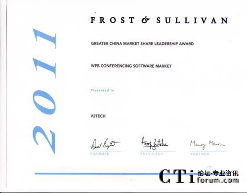 CTI論壇(ctiforum)1月12日消息(記者 浩宇):全球領(lǐng)先的Web會議解決方案供應(yīng)商V2威速宣布,榮獲全球領(lǐng)先咨詢公司Frost&Sullivan頒發(fā)的“大中華區(qū)Web軟件會議市場份額領(lǐng)導(dǎo)者”殊榮。Frost & Sullivan設(shè)立該獎項旨在表彰各個行業(yè)領(lǐng)域在過去一年業(yè)績表現(xiàn)最佳并占有最高市場份額的企業(yè)。