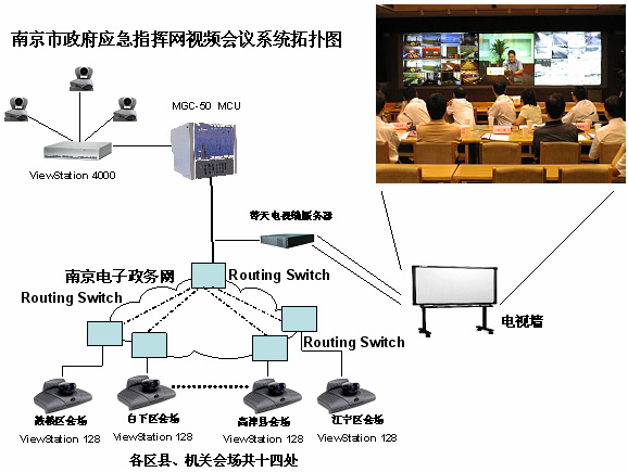 南京市政府利用南京市電子政務(wù)網(wǎng)的網(wǎng)絡(luò)基礎(chǔ),建立政府視頻會(huì)議指揮系統(tǒng),連接14個(gè)區(qū)縣政府及機(jī)關(guān),會(huì)議帶寬為768Kbps。利用本系統(tǒng)實(shí)現(xiàn)快速召集全市關(guān)鍵部門(mén)的會(huì)議。