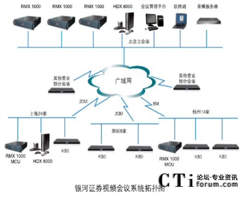銀河證券視頻會議系統(tǒng)采用寶利通視頻會議產(chǎn)品,在銀河證券北京總部中心機房配備寶利通新一代實時媒體會議平臺 RMX 1000 MCU和高清錄播服務器;在上海和杭州也分別配置了RMX 1000 MCU;