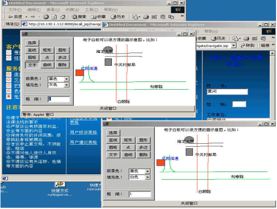 電子白板功能是在語音文字交談之外,ICWEB為用戶提供的圖形交談工具。電子白板允許多個在線用戶同時在界面里繪制刪除任意圖形,寫字、插入圖片以及用標(biāo)志工具標(biāo)示某些區(qū)域。電子白板功能可以有效地補(bǔ)充文本交談功能所不具備的圖示功能。