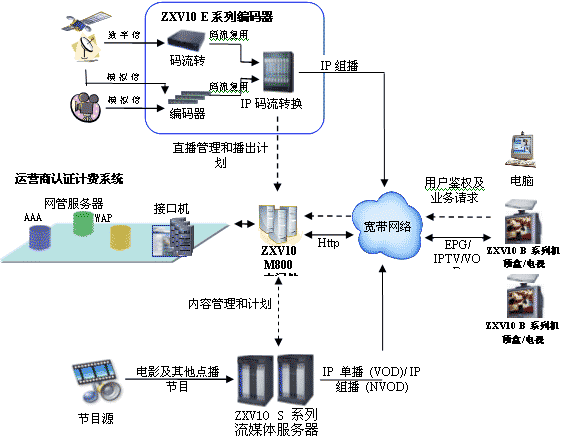 中興通訊ZXV10 IPTV/VOD整體解決方案是專門針對電信運(yùn)營商多媒體服務(wù)而設(shè)計(jì)的綜合解決方案。該系統(tǒng)可提供網(wǎng)絡(luò)電視(IPTV)、視頻點(diǎn)播(VOD)、準(zhǔn)視頻點(diǎn)播(NVOD)、電子節(jié)目指南(EPG)等多種寬帶多媒體業(yè)務(wù),系統(tǒng)全面支持xDSL和FTTx接入,支持MPEG2、MPEG4、WMV9等多種視音頻格式,在為運(yùn)營商提供具有極高競爭力的、特色鮮明服務(wù)的同時,最大限度地提高運(yùn)營商的收入。