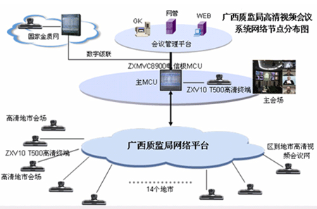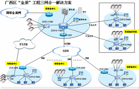 憑借全面的融合通信產(chǎn)品和解決方案、豐富的電子政務(wù)工程建設(shè)和實施經(jīng)驗,中興通訊為廣西“金質(zhì)工程”(一期)系統(tǒng)“量身定做”出一整套基于IP融合、使用方便靈活的解決方案:將整個系統(tǒng)分為兩個部分,即區(qū)質(zhì)監(jiān)局一級節(jié)點(diǎn)信息中心、各地市質(zhì)監(jiān)局及相關(guān)研究機(jī)構(gòu)共計15個二級節(jié)點(diǎn)信息中心,在管理上體現(xiàn)垂直的系統(tǒng)架構(gòu)。整個網(wǎng)絡(luò)可以看作一個分級的星形網(wǎng)絡(luò),結(jié)構(gòu)簡單、易于擴(kuò)展。