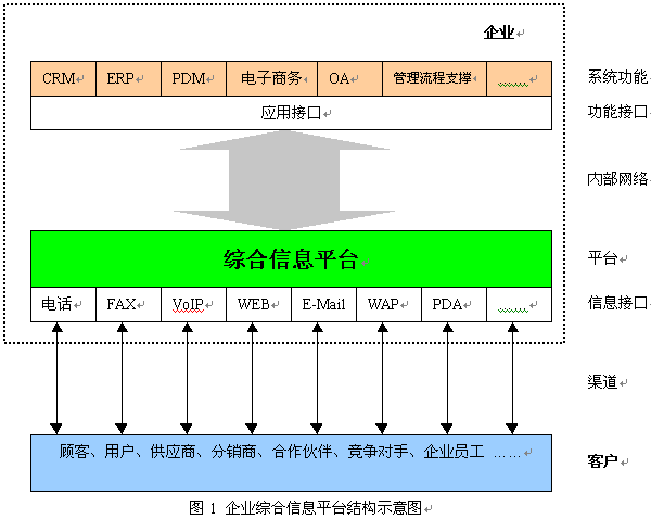 企業(yè)綜合信息平臺(tái)是一個(gè)完全從客戶出發(fā),并能更好地為客戶服務(wù)的一個(gè)平臺(tái)。這里我們所指的“客戶”是一個(gè)廣義的概念,綜合信息平臺(tái)的客戶不僅包括企業(yè)的客戶、用戶,而且還包括企業(yè)內(nèi)部的員工、企業(yè)的供應(yīng)商、分銷商及合作伙伴,甚至還包括企業(yè)的競(jìng)爭(zhēng)對(duì)手。綜合信息平臺(tái),保證了企業(yè)內(nèi)部之間、企業(yè)與客戶之間的信息流得到暢通、高效的處理,可以高效、高質(zhì)量地為客戶服務(wù),提高客戶的滿意度和忠誠(chéng)度,同時(shí)使企業(yè)內(nèi)部的信息實(shí)現(xiàn)共享,并能支撐企業(yè)信息化各環(huán)節(jié)對(duì)客戶數(shù)據(jù)的依賴,為企業(yè)信息化建設(shè)提供了一個(gè)開(kāi)放性的平臺(tái)。