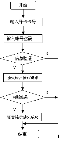 此功能為用戶提供賬號(hào)臨時(shí)掛失業(yè)務(wù),使用戶的損失減到最小。 用戶通過特定的接入碼進(jìn)入呼叫中心,選擇賬戶掛失后,呼叫中心語音提示用戶輸入帳號(hào)密碼,平臺(tái)將用戶的數(shù)據(jù)送至金融主機(jī)系統(tǒng),然后根據(jù)返回的信息將處理結(jié)果語音提示給用戶。用戶臨時(shí)掛失后,還必須到營業(yè)前臺(tái)進(jìn)行正式的掛失操作。流程圖如下圖。