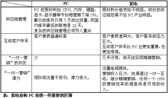 聯(lián)想長(zhǎng)期構(gòu)筑的、在中國(guó)PC制造業(yè)的核心競(jìng)爭(zhēng)力,正受到戴爾的巨大威脅,導(dǎo)致聯(lián)想開始轉(zhuǎn)而采用戴爾的按客戶需求定制、直接銷售的模式,希望建立新的核心競(jìng)爭(zhēng)力,再度引領(lǐng)中國(guó)PC產(chǎn)業(yè)。IT制造業(yè)的巨變,戴爾的成功給陷于低層次競(jìng)爭(zhēng)的家電產(chǎn)業(yè)很大的啟發(fā),曾經(jīng)鑄造中國(guó)家電企業(yè)輝煌的核心競(jìng)爭(zhēng)力急需注入新的生命力,以適應(yīng)新的競(jìng)爭(zhēng)形勢(shì)。計(jì)算機(jī)技術(shù)、互動(dòng)通信技術(shù)的進(jìn)步以及互聯(lián)網(wǎng)的出現(xiàn)使企業(yè)能夠建立與用戶之間一對(duì)一的密切客戶關(guān)系,使服務(wù)創(chuàng)造價(jià)值,IT技術(shù)推動(dòng)技術(shù)、產(chǎn)品、生產(chǎn)、銷售和營(yíng)銷的發(fā)展,支撐家電企業(yè)建立新的核心競(jìng)爭(zhēng)力。在同質(zhì)化競(jìng)爭(zhēng)的環(huán)境下,家電企業(yè)也許更應(yīng)該從服務(wù)、營(yíng)銷、銷售方面來(lái)建立自己的核心競(jìng)爭(zhēng)力。海爾就是典型的例子,海爾的發(fā)展與它完善的服務(wù)體系和服務(wù)制度是分不開的。聚焦于服務(wù)、營(yíng)銷、銷售的客戶關(guān)系管理(CRM)系統(tǒng)讓家電企業(yè)看到了新的希望。可以預(yù)言,CRM將為家電業(yè)點(diǎn)燃一盞新啟航燈。