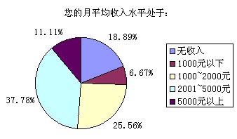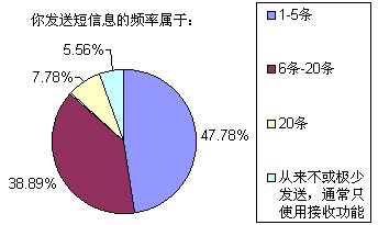 以上選擇中,選擇答案A~E的被訪者比例分別為18.89%、6.67%、25.56%、37.78%和11.11%,也就是說我們這次調(diào)查的重頭是放在一般收入水平和無收入(學(xué)生)兩類人群,這兩個人群也正是SMS市場上最活躍的分子。高收入和低收入人群要么因為資金充裕而選擇語音業(yè)務(wù),要么就是因為資金的缺乏而盡量不使用移動通信方式。