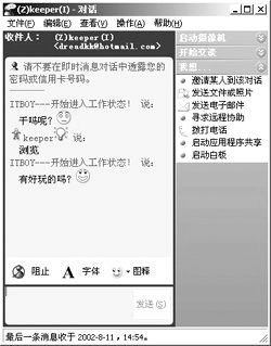 聊天功能是IM軟件最基本、也是最重要的功能,基本上每一種IM軟件在這個(gè)功能上的操作都差不多:如果用戶想與聯(lián)系人進(jìn)行聊天,可以雙擊IM中聯(lián)系人的頭像,在彈出的對(duì)話框中敲入文字信息發(fā)送即可。QQ的特點(diǎn)是可以給不在線的朋友發(fā)送信息,對(duì)方下次上線的時(shí)候可以收到,MSN雖然不具備這樣的功能,但是它在聊天過程中可以使用各種漂亮的表情圖標(biāo)為聊天添加了不少情趣。
