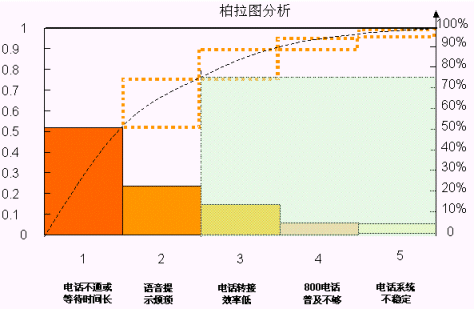 通過匯總的數(shù)據(jù)進行分析,他們發(fā)現(xiàn)客戶不滿意的原因很多,于是選取了最大的五個原因, 用"柏拉圖"做了分析,同時,對于這最重要的五個原因又作了一次頭腦風暴和"魚骨圖分析"。