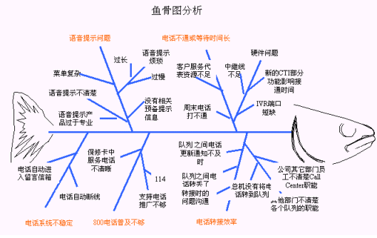 小組成立后,面臨的第一個問題是選取一個合適的要解決的問題。選題工作按照三個原則:呼叫中心要迫切解決的問題,"項目小組"可控的問題(即不能大大超過"項目小組"可控的資源,權限)和在時間上可控的問題(不能是在遙遙無期后才能見效的問題)。最終,經(jīng)過頭腦風暴,最終選定了一個問題"如何提高客戶對電話接通的滿意度",因為呼叫中心面臨一個很重要的問題是客戶對電話接通的狀況滿意度不高,只有70%,有30%的客戶感到"一般"、"不滿意"和"很不滿意"。
