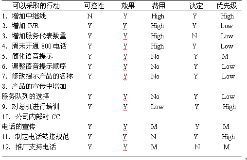 項目小組接下來對列舉的眾多原因合并、歸類并再次進行頭腦風暴,并"可控性"、"實施預期效果"、"實施費用"、"是否可以由項目小組作決定"、"優(yōu)先級"等幾個方面對可以采取的行動進行逐項分析(見下圖),最終確定1、5、9、10、11、12項納入到實施方案,指定相應的實施負責人,制定相應實施時間表,實施時長為三個月。