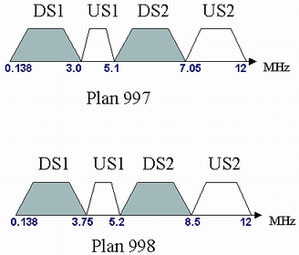 此標(biāo)準(zhǔn)從中國(guó)的實(shí)際情況出發(fā),既適應(yīng)接入網(wǎng)絡(luò)總體流量的非對(duì)稱特性,又考慮滿足一些對(duì)上行速率要求較高、接近對(duì)稱的業(yè)務(wù)需求;既考慮當(dāng)前技術(shù)和設(shè)備狀況,又兼顧未來(lái)技術(shù)發(fā)展和一段時(shí)期內(nèi)可能的業(yè)務(wù)需求,提出了中國(guó)的VDSL頻段劃分方式。這種方式在Plan998