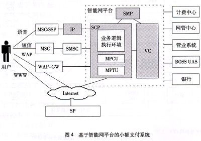 鑒于以上原因,目前中國移動正在建設的全國范圍的小額支付系統(tǒng)已確定采用基于智能網平臺的建設方式。基于智能網平臺的小額支付系統(tǒng)如圖4所示。