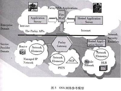 為了克服傳統(tǒng)智能網的上述不足,開放業(yè)務體系結構(OSA,Open Service Architecture)應運而生。如圖5所示,OSA是一種全新的業(yè)務體系結構,主要包括底層通信網絡,高層的應用服務器(Application