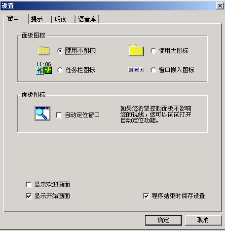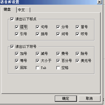 如果需要進(jìn)一步的調(diào)整,可以選擇菜單里的“設(shè)置……”。打開設(shè)置窗口(如圖3)。窗口共分四個選項(xiàng),每個選項(xiàng)里除了剛介紹的幾種常用功能調(diào)整外,還可以控制歡迎畫面、開始畫面、設(shè)定存儲等功能,規(guī)定提示速度、朗讀速度的快慢,選擇提示方式,設(shè)定提示報警條件。在“語音庫”選項(xiàng)中還可以選擇朗讀為男聲還是女聲。單擊“設(shè)置”按鈕,可以根據(jù)具體需要選擇“鍵盤”或“中文”里被朗讀標(biāo)點(diǎn)符號的種類(如圖4)。