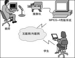 對(duì)于需要上課的學(xué)生,可以利用MPEG-4交互教學(xué)系統(tǒng),在自己的家里觀看教師講課,不但能看到教師,還可以同步看到教師計(jì)算機(jī)屏幕上的講義。如果在學(xué)生家里的計(jì)算機(jī)上安裝了麥克風(fēng)和攝像頭,還可以進(jìn)行視頻交流,“面對(duì)面的”溝通。學(xué)生可以“舉手”回答老師的問題,學(xué)生之間可以討論,老師可以進(jìn)行網(wǎng)上測(cè)驗(yàn)。