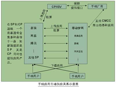 在這樣一個(gè)全新的銷售模式下,運(yùn)營(yíng)商的作用也越發(fā)凸顯出來(lái)!皦(mèng)網(wǎng)是一個(gè)大的平臺(tái),SP是個(gè)小平臺(tái),SP再通過(guò)與CP建立合作,進(jìn)而將整個(gè)應(yīng)用市場(chǎng)與終端連接起來(lái),F(xiàn)在,我們?nèi)康膽?yīng)用都放到夢(mèng)網(wǎng)上面了!北本﹫(bào)童電子商務(wù)公司的一個(gè)工作人員說(shuō)。移動(dòng)夢(mèng)網(wǎng)的建立,事實(shí)上在手機(jī)廠商、應(yīng)用開發(fā)商、用戶三者之間搭了一個(gè)橋梁,將各種手機(jī)應(yīng)用集中在一個(gè)門戶網(wǎng)站,用戶需要時(shí),只需登陸到夢(mèng)網(wǎng)上面,點(diǎn)擊相關(guān)的網(wǎng)頁(yè),就可隨時(shí)下載所需要的應(yīng)用。